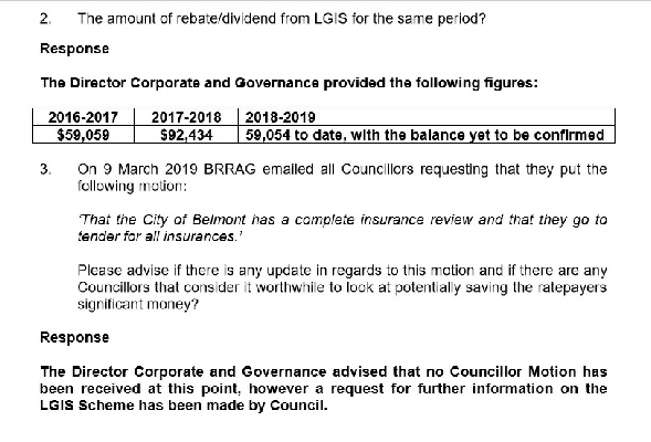The City of Belmont gets their insurances for workers compensation, public liability and property from the preferred supplier as provided by WALGA. Other councils have found savings by going to tender for these insurances. We asked the CoB to do the same. Any savings could be better utilised for the benefit of the Residents.